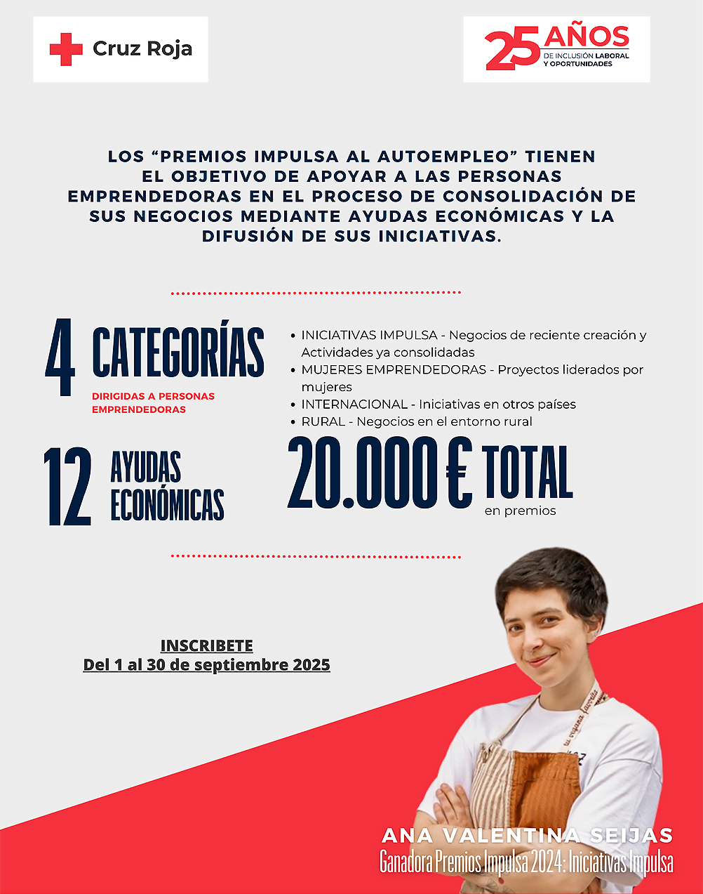- Los premios ‘Impulsa al Autoempleo’ entregarán 20.000 euros en una sexta edición muy especial ya que se celebran los 25 años del Plan de Empleo de Cruz Roja Española.