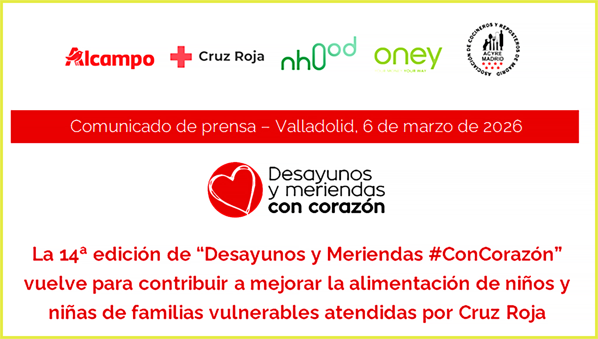 Valladolid, 6 de marzo de 2026. Alcampo y Cruz Roja, en colaboración con Oney, Nhood y la Asociación de Cocineros de Madrid (ACYRE Madrid). ponen en marcha en Castilla y León, desde hoy día 6 y hasta el 12 de marzo, la 14ª edición de la campaña solidaria “Desayunos y Meriendas #ConCorazón”, que se desarrollará en 73 tiendas de la Comunidad con el objetivo de contribuir a mejorar la alimentación de niños y niñas de familias en situación de vulnerabilidad.